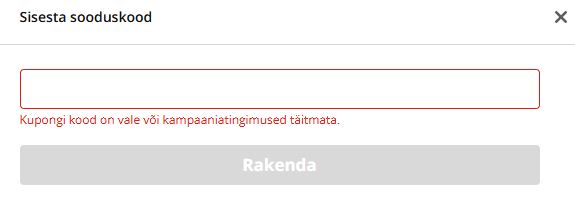 - Kehtetu koodi korral või kui kampaaniatingimused pole täidetud (näiteks miinimum ostusumma) kuvatakse veateade "Kupongi kood on vale".