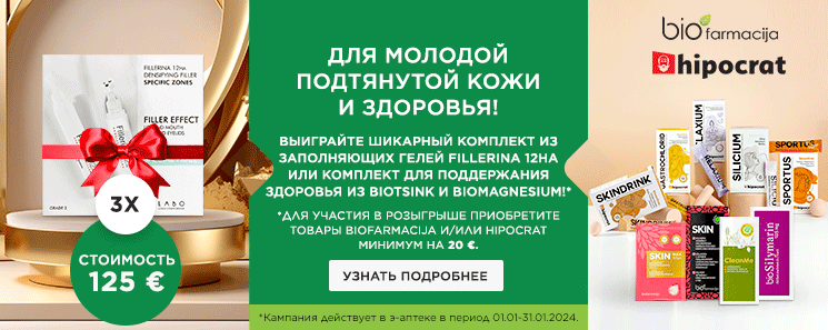Для участия в розыгрыше необходимо совершить покупку товаров Biofarmacija и/или Hipocrat в э-аптеке Евроаптека на сумму не менее 20 € (минимальная стоимость одной корзины) в период с 01-31.01.2024. Скидка применяется только к цене товара и не распространяется на стоимость упаковки, доставки и подарочные карты.